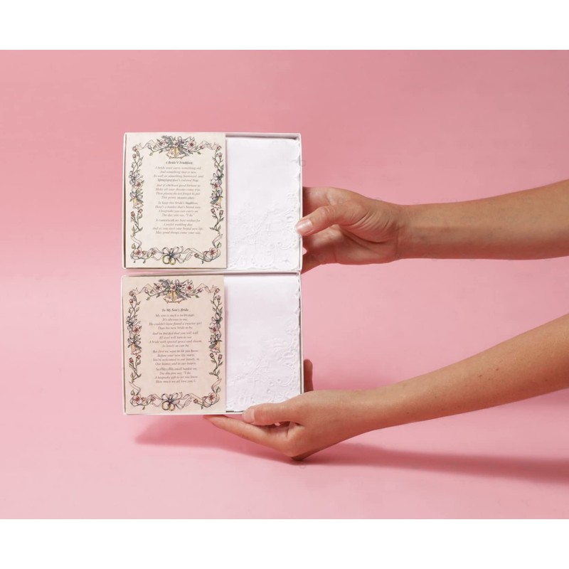 A wedding day is one of the most important times in a bride’s life and as a family member or a friend you want to celebrate and commemorate her event with something special. That’s why we created the Wedding Collectibles lace embroidered poetry handkerchief, a unique and beautiful keepsake accompanied by a poem rich in all the reasons you love the bride.