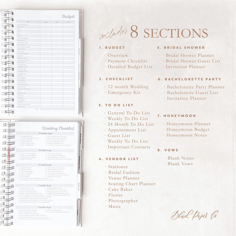 - ๐ช๐ฒ๐ฑ๐ฑ๐ถ๐ป๐ด ๐ฃ๐น๐ฎ๐ป๐ป๐ฒ๐ฟ & ๐ข๐ฟ๐ด๐ฎ๐ป๐ถ๐๐ฒ๐ฟ - 180 page quality wedding planning book, with 8 tab dividers to help you plan your wedding. Tab divided sections are: Budget Checklist To Do List Vendors Bridal Shower Bachelorette Party Honeymoon Notes/Vows ๐๐ผ๐๐ป๐๐ฑ๐ผ๐๐ป ๐ฃ๐น๐ฎ๐ป๐ป๐ถ๐ป๐ด ๐ ๐ฎ๐ฑ๐ฒ ๐๐ฎ๐๐- This complete planner has an 24 month countdown calendar to help you organize your day as well as a 12 month bullet point checkpoint list to ensure nothing gets missed.