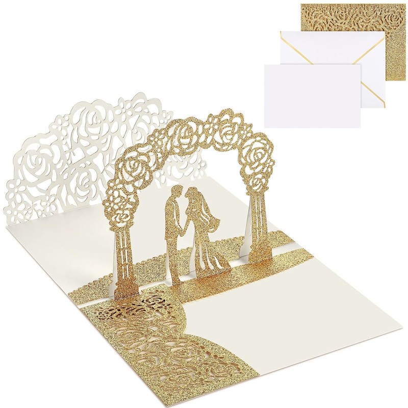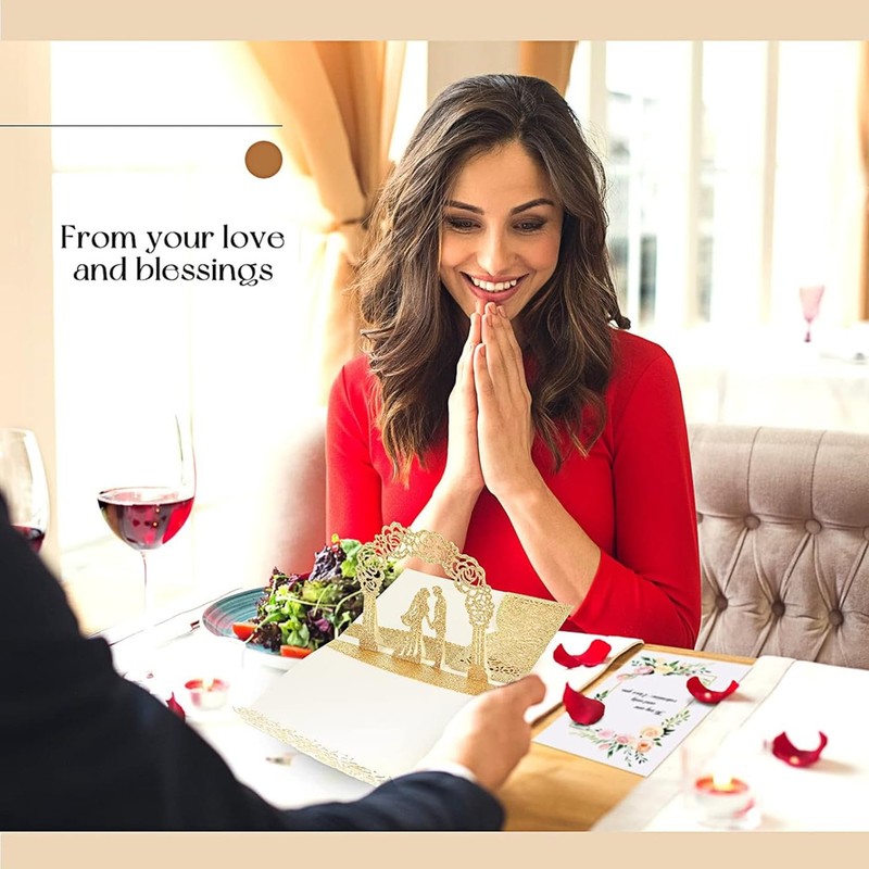 Wedding Pop-up Card Set, 3D Greeting Anniversary Romantic Congratulations with Envelope for Bride and Groom Valentine's Day Engagement Party Supplies (Gold)