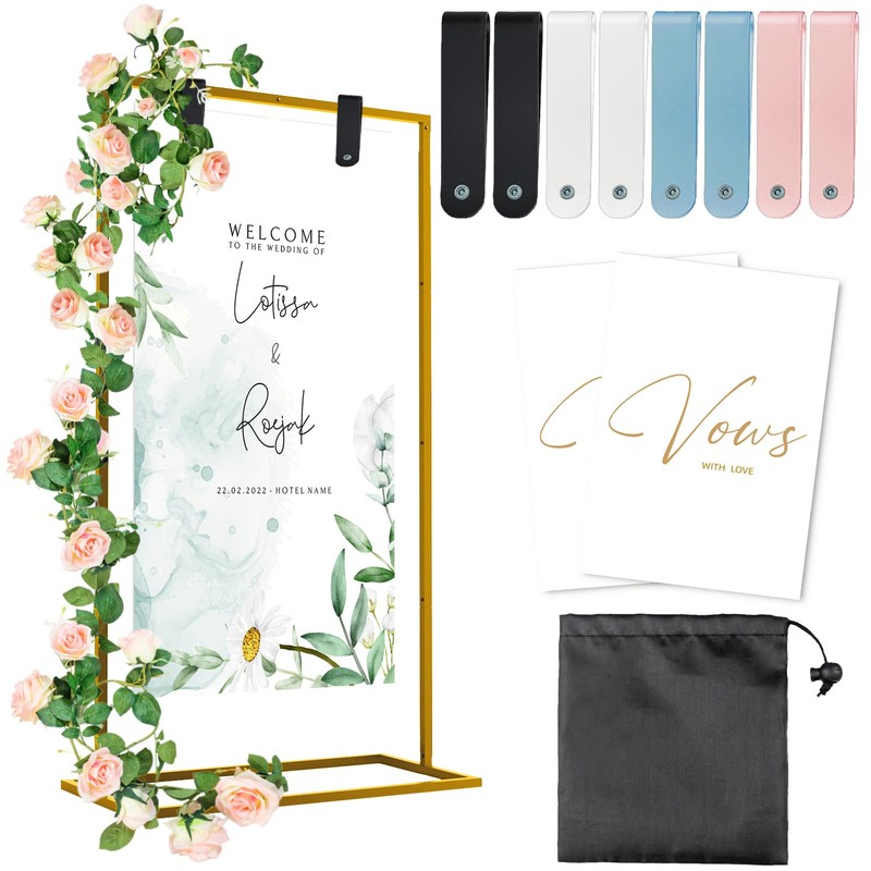 - Wedding Easel Stand: Wedding signs packaging includes 8 leather hooks, a decorative artificial flower vine, and cards. You can use the decorations according to your own decoration needs, perfectly integrating the entire event occasion