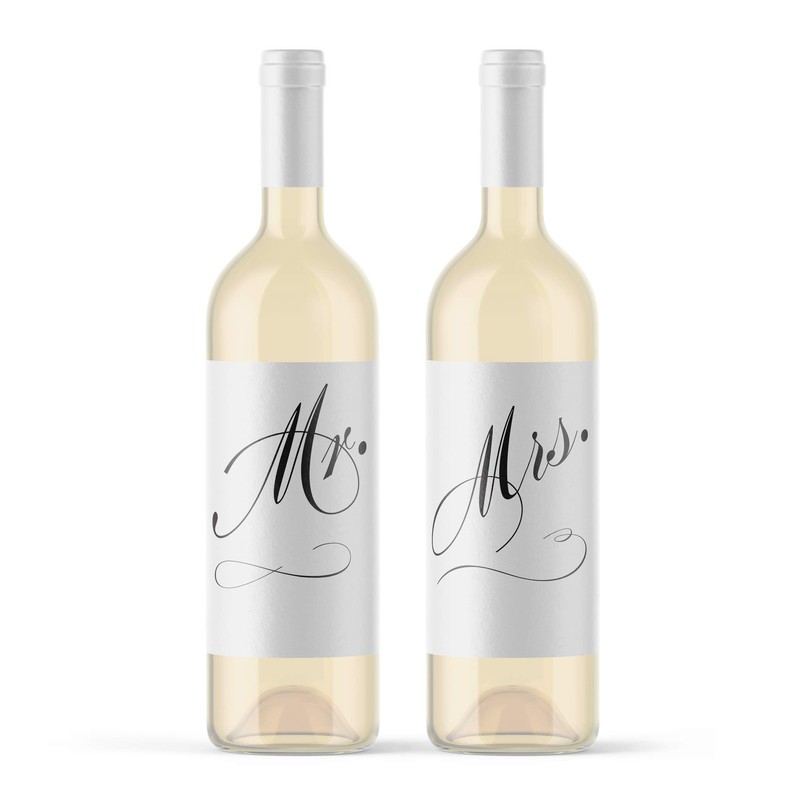 Wedding Wine Bottle Labels Mr. and Mrs. Bride and Groom Gifts for Bridal Shower or Wedding Reception | Mister & Misses | Mr. Mrs. Script Table Decor | Black & White Formal Elegant Script