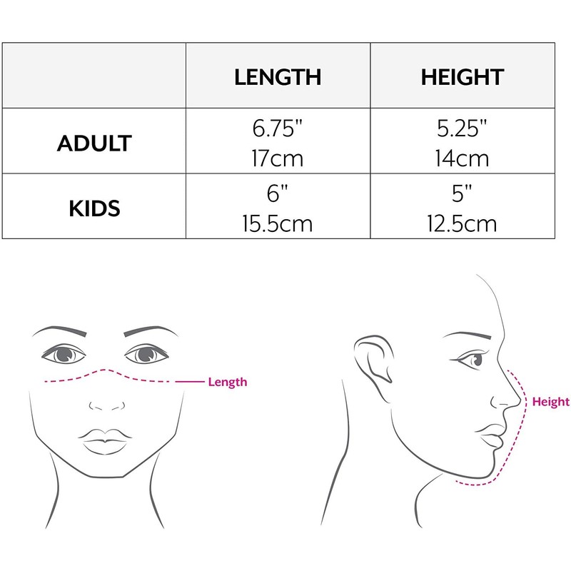 - Mask: 6.75" (L) x 5.25" (H), Ear Straps: 3.55". Face mask only.