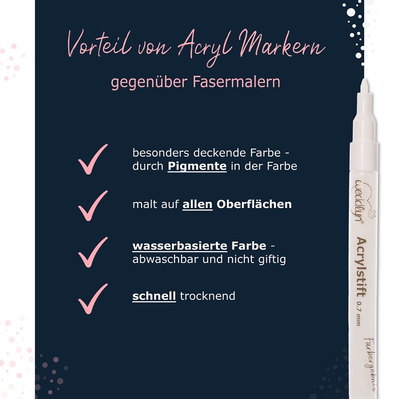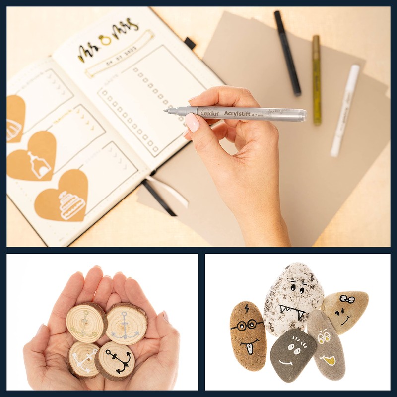 - For your creativity - Use the colouring pens for wood, hand lettering, for the guest book for the wedding, for the photo album, as a foil pen and much more. With the 0.7 mm thin lead, the markers are also perfect for delicate details.