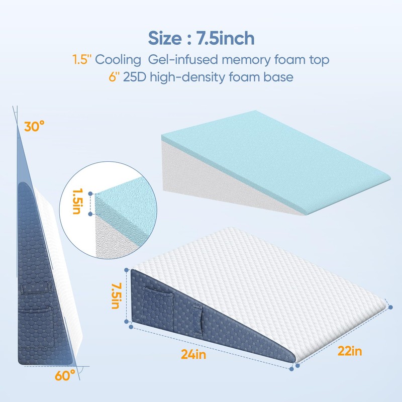 Welzona Wedge Pillow for Sleep, 7.5inch Bed Wedge Pillow for Headboard, Acid Reflux, Heartburn, GERD, Neck Pain, Cooling Memory Foam Top, Removable Washable Cover Wedge Pillow for Improved Sleep