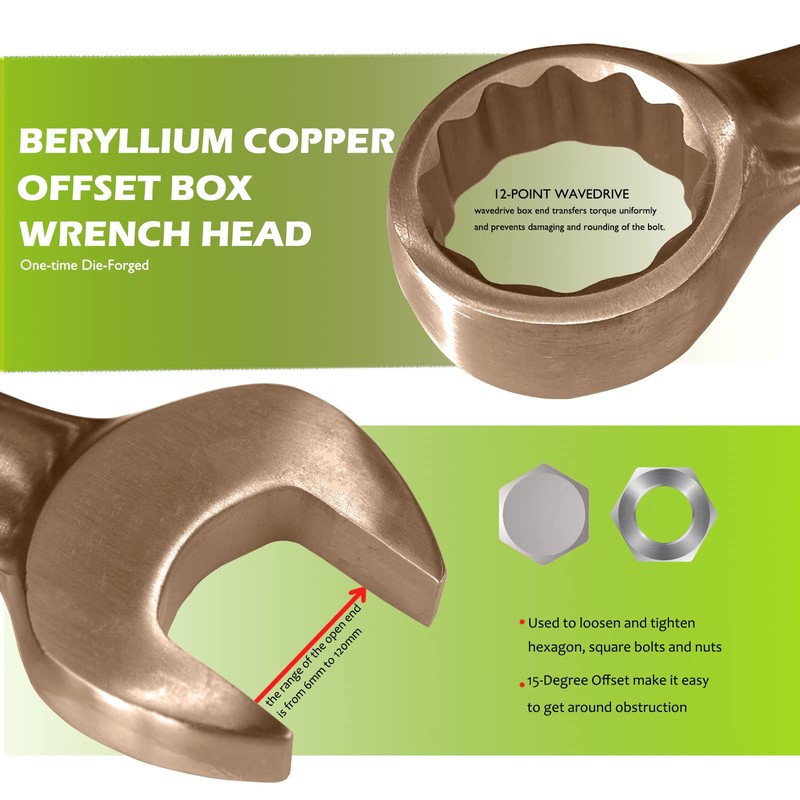 - Advanced Die-forged Process: Beryllium Copper Non-Sparking Combination Wrenches One-time Die-forge, high hardness, strong torque, Completely in accordance with Germany DIN standard. Anti slip, wear-resistant, Precision Casting Technology.