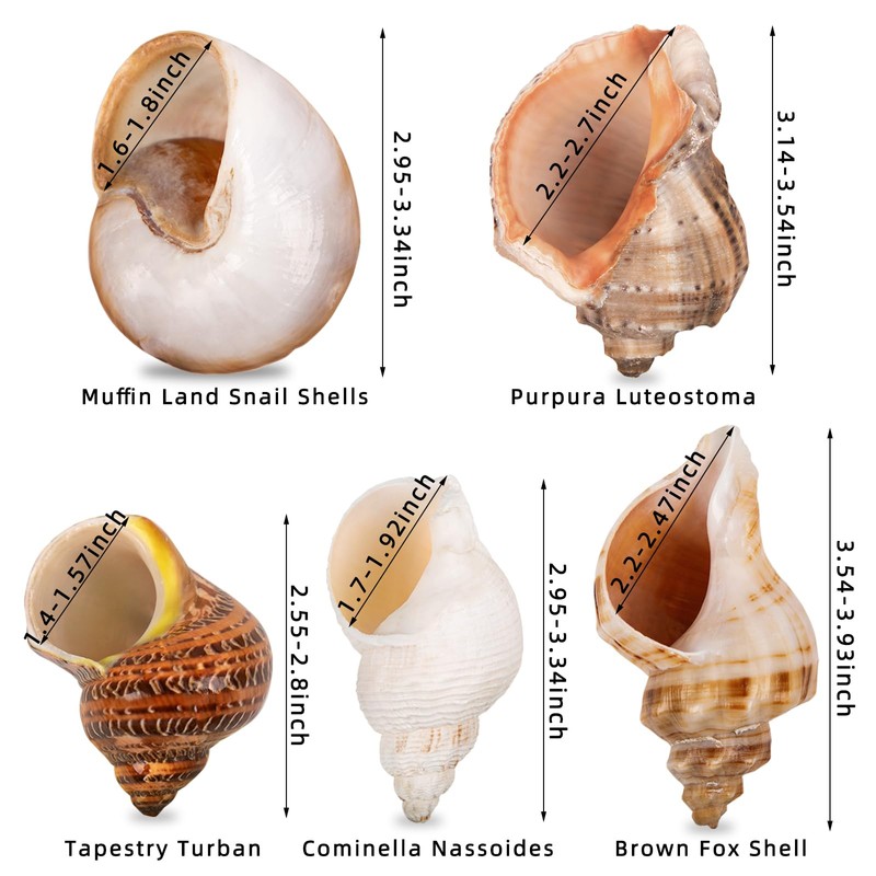 - 【5PCS Medium Large Shells】Our package includes 5 high-quality hermit crab shells medium large, ranging in sea conch size from 2.8 to 3.9 inches, opening Size:1.5 - 2.7 inches. Each shell is carefully selected to provide a variety of sizes within this range, ensuring a perfect fit for your medium and large hermit crabs.