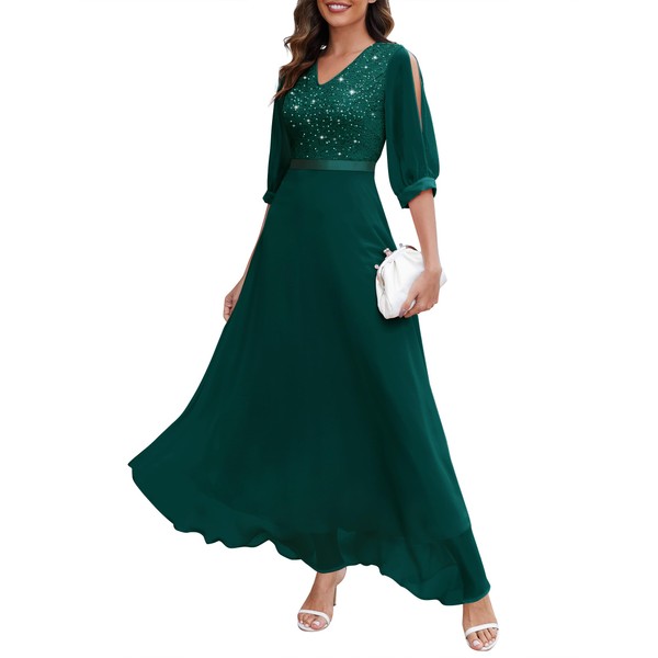 Wedtrend Evening Dress, Elegant for Wedding, V-Neck Chiffon Cocktail Dress, Women's Long Prom Dress with Split Sleeves, Half Sleeve Lace Dress with Sequins, dark green