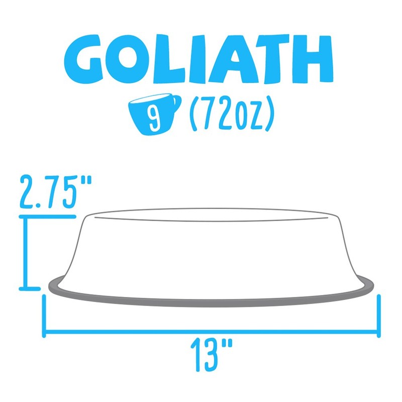 **A Dish for Every Dog!** Pick the size that best suits your pup ‣ Toy -- 1/2 cup (4oz.) 5.75" diameter, 1.25" tall ‣ Terrier -- 1 cup (8oz.) 7" diameter, 1.75" tall ‣ Rover -- 2 cups (16oz.) 8.5" diameter, 2" tall ‣ Bruiser -- 3 cups (24oz.) 10" diameter, 2.25" tall ‣ Kahuna -- 5 cups (40oz.) 11.5" diameter, 2.5" tall ‣ Goliath -- 9 cups (72oz.) 13" diameter, 2.75" tall