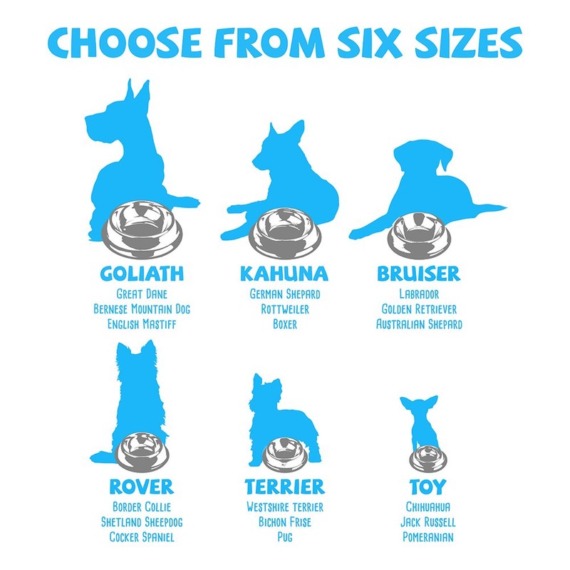 - A dish for every dog! Available in six sizes: Toy, Terrier, Rover, Bruiser, Kahuna, and Goliath