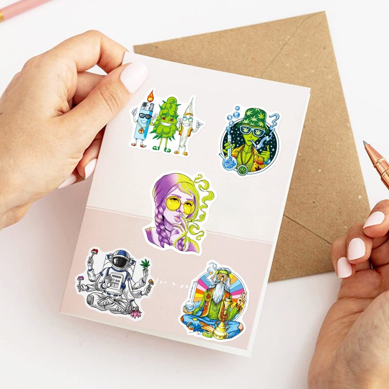 - Wide Applications The mixed weed stickers work well for laptops, water bottles, cars, notebooks, bicycles, envelopes, greeting cards, skateboards, gift wrapping and so on, making your belongings more attractive and charming.