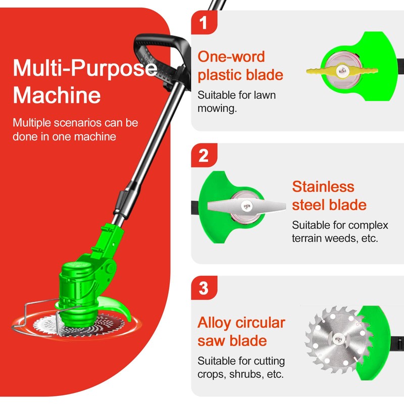 - 【3 Types of Cutting Blades】: Weed wacker The cordless weed trimmer with different blades to meet different weeding needs. Plastic blade, suitable for cutting grass; stainless steel blade, suitable for fast cutting lawn, weeds, small shrubs; manganese steel circular saw blade, strong cutting ability, suitable for cutting thick shrub branches