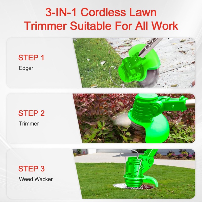 - 【3-In-1 Compact Weed Wacker】Weed wacker An all-in-one cordless push lawn mower, trimmer and edger. You can even use it as a pole saw.It is also easy to convert from to wheeled Lawn Mower. Make your lawn the envy of the neighborhood