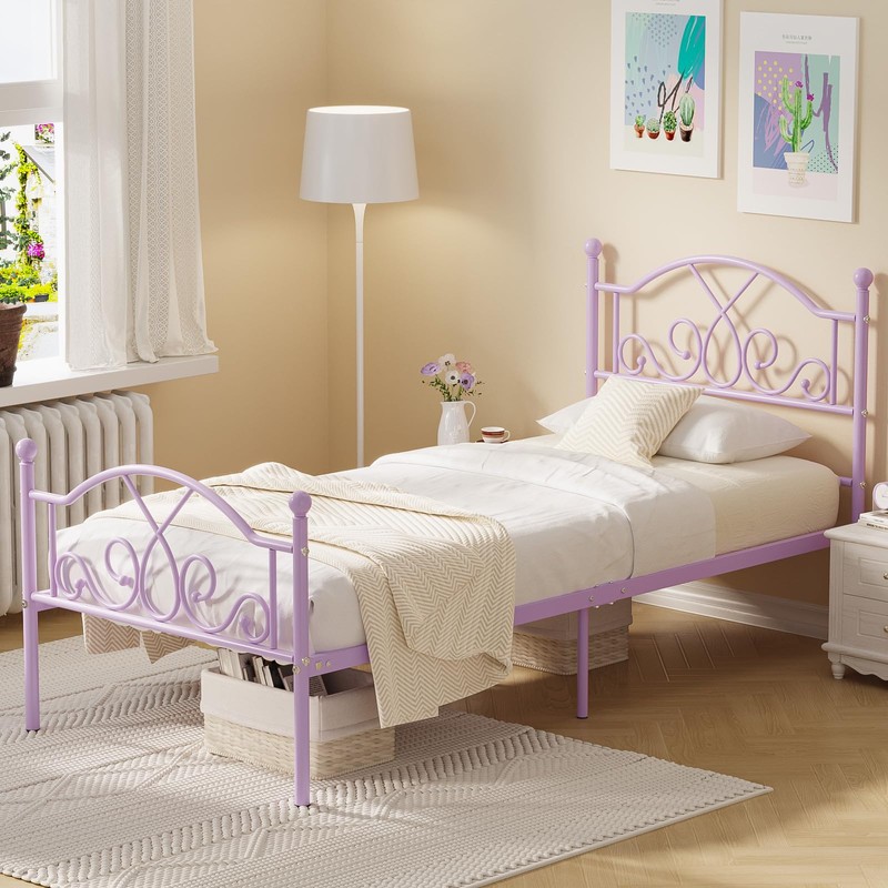 Weehom Twin Bed Frames, Modern Twin Size Metal Bed Frames for Kids Girls, No Box-Spring Needed Twin Platform Bed Frame with Headboard, 11.23 Inches Storage Space - Purple