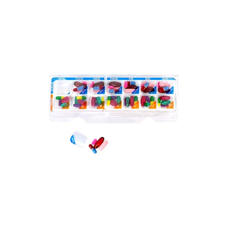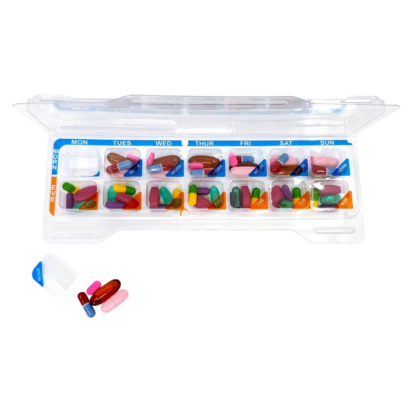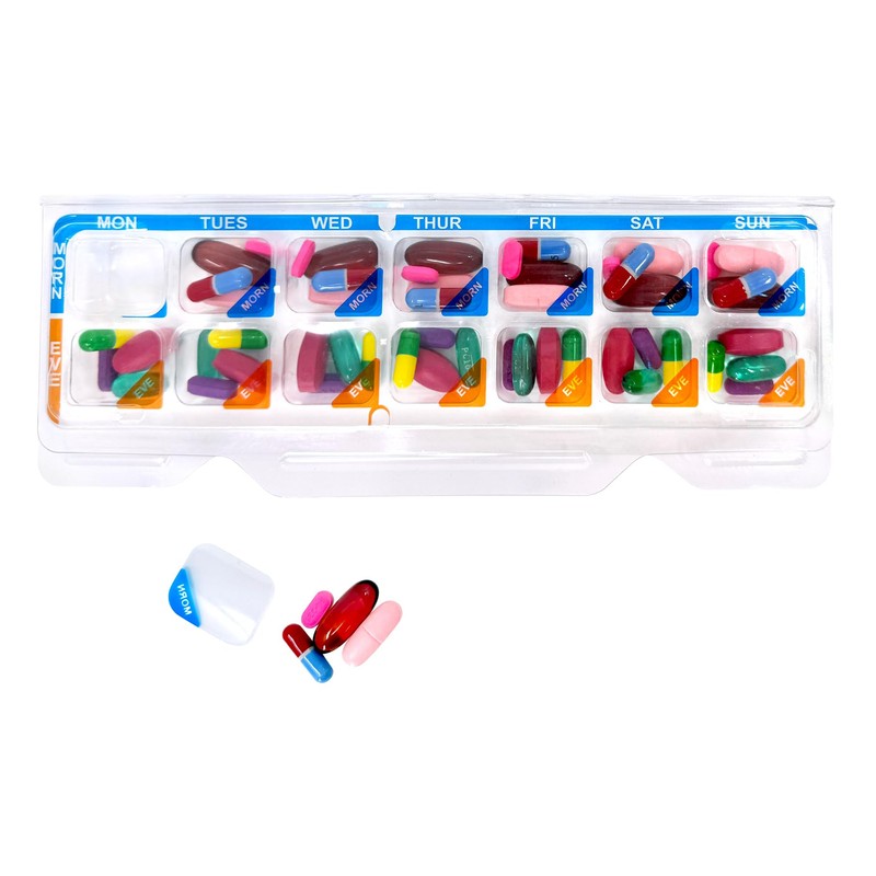 - Weekly 2x/Day Medication Tray: Organize morning and evening pills for a full week with 14 compartments in each tray.