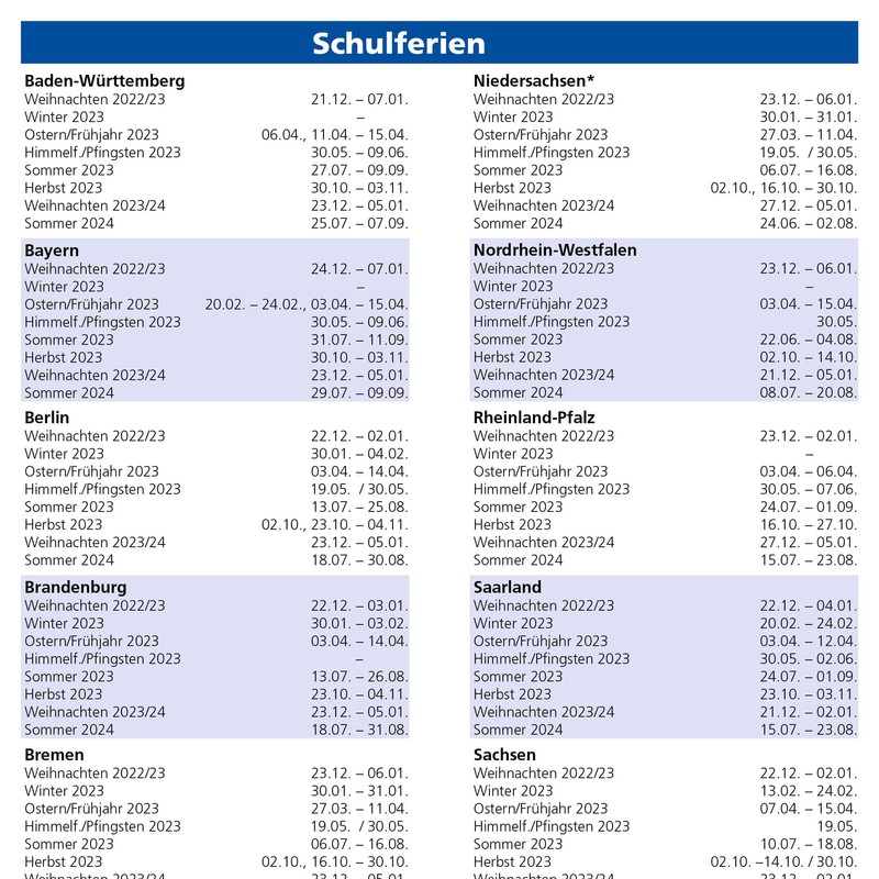 - The diary has a holiday overview of the federal states and other useful everyday information