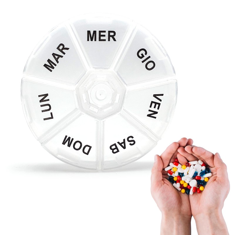 The round weekly pill box is the ideal accessory for organising your medicines, vitamins and supplements in a practical and safe way. With a diameter of 8.5 cm, this compact organizer offers 7 large compartments, each clearly marked with the name of the day in Italian, for easy and immediate use.