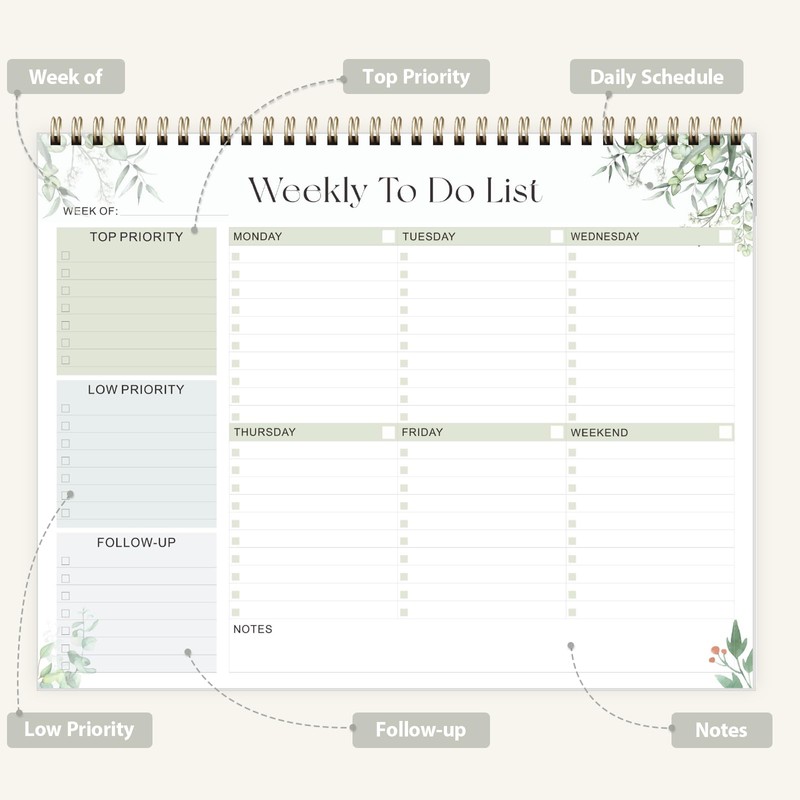 - THOUGHTFUL FEATURES FOR PLANNING - Our weekly to do list notepad is designed with a top priority, a low priority, and a follow-up section, allowing you to prioritize and stay organized. It also has to do list part, notes part, which can help you track important daily events and develop daily habits.
