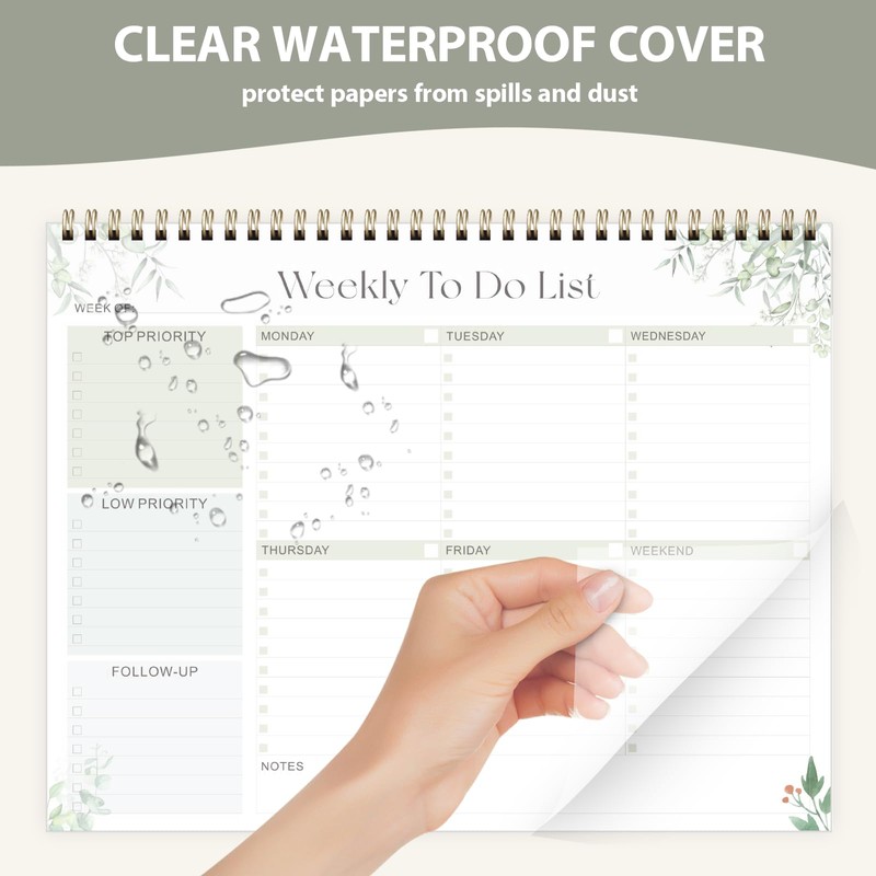 - SPIRAL BOUND WEEKLY PLANNER - The weekly planner is spiral-bound for easy page turning and the option to tear off used pages for new plans. It features a transparent cover that protects your pages from dirt and damage.