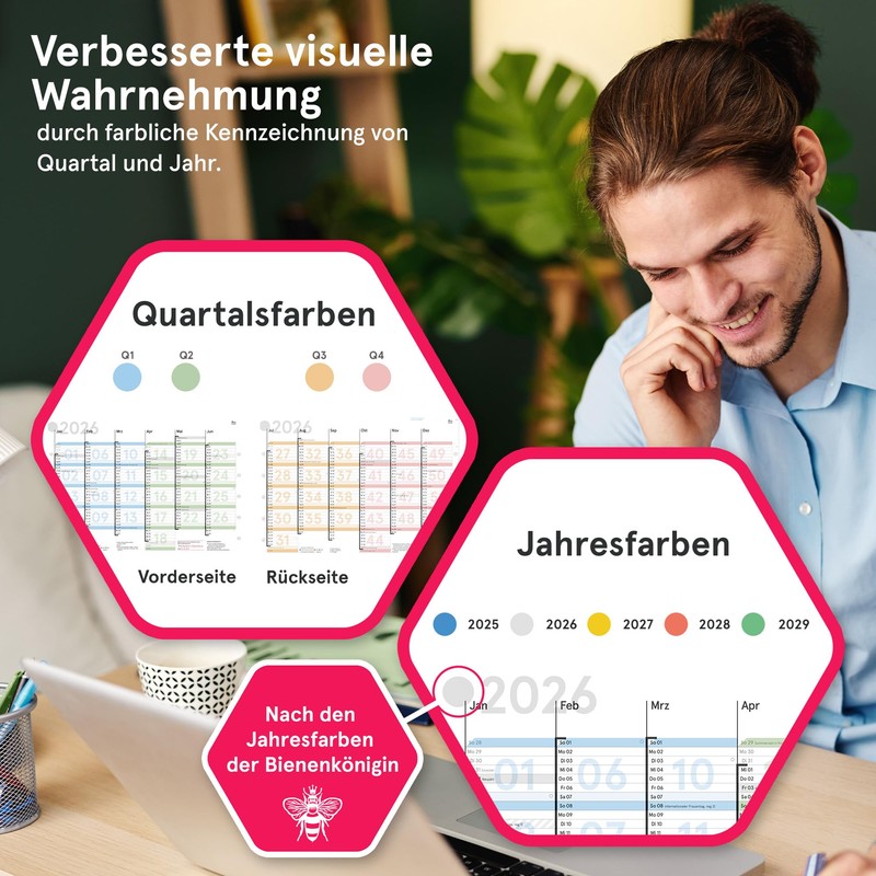 - YEAR OVERVIEW WITH COLOUR SYSTEM: Keep an eye on the whole year with colour-divided quarters; days of the week are arranged in a row for easier work organisation.