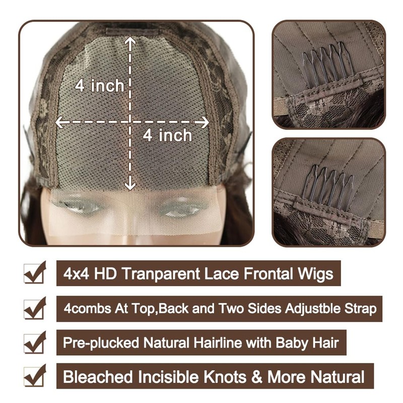 - 4 x 4 lace closure wigs human hair construction: it have adjustable straps and 4 combs around your ears for different sizes of head circumference, elastic net is more breathable and comfortable, free part can be side anyway, cap size is 22.5 inches for medium size.