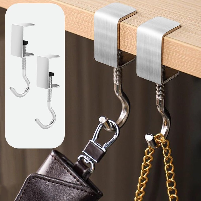 - No Drilling Required, Won't Damage Furniture:Very easy to install, just clip it on the edge of the table. No drilling required and will not damage furniture. The screw adjustment design keeps the hook firmly in place and prevents it from falling off on impact