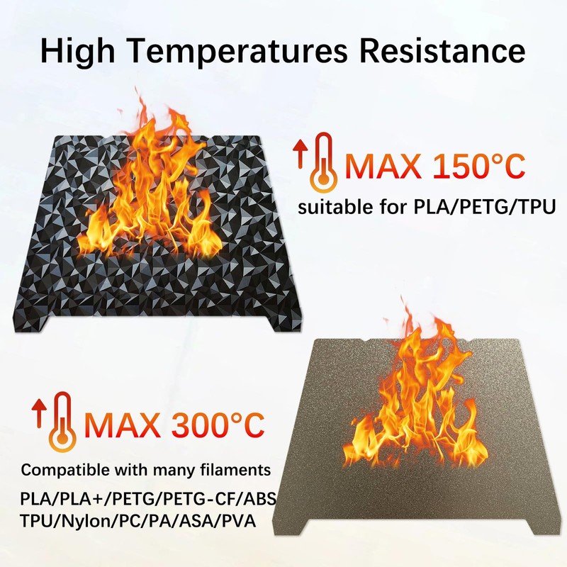 • 【High Temperature Resistance and Compatible Filaments】The PEO print bed surface is resistant to high temperature 150°C and textured PEI coating bed is 300℃,After our extensive testing, we recommend PET to print PLA / TPU /PETG,If you want to print other filaments, please adjust the parameters. And It is good to print PLA/PLA+/PETG/PETGCF/ABS/TPU/Nylon/PC/PA/ASA/PVA on PEI surface.