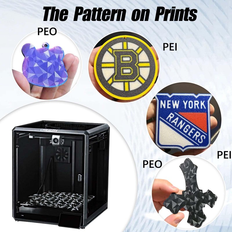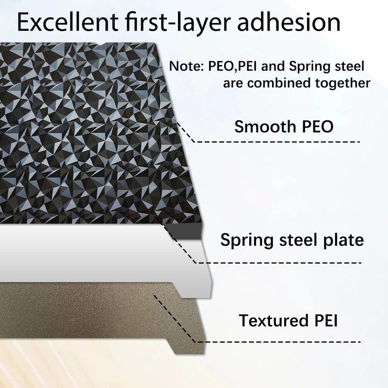 • 【Upgraded build plate】Double-sided PEO+PEI spring steel plate .One side is upgraded PEO film .PEO looks like countless diamonds on the surface,which make your eyes light up.The other side is texture PEI.It is like fine sand on a golden beach, very durable and resistant to high temperatures.It has been popular for a few years and remains a favorite among 3D printer enthusiasts.One build plate has two beautiful patterns. The bottom of the prints will leave a unique pattern.