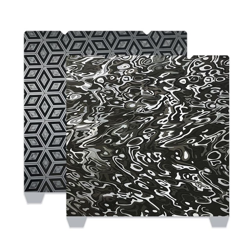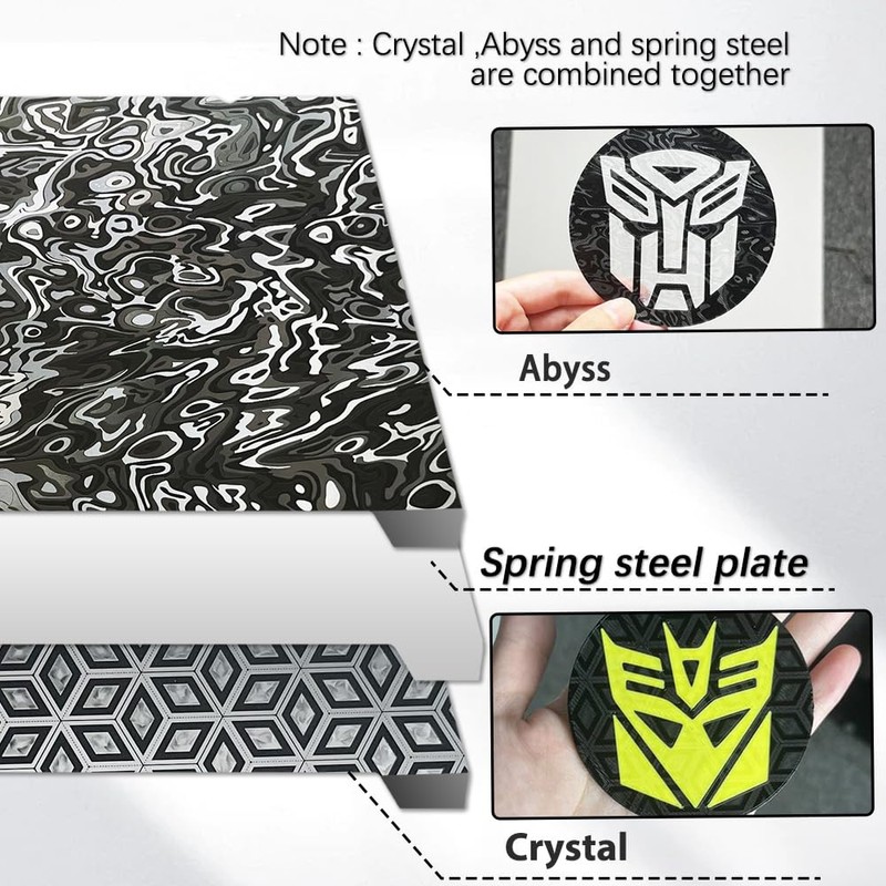- 【Crystal+Abyss Build Plate 】The new holographic pattern of Crystal and Abyss bring more creativity to your 3D printing. There is a Crystal pattern on one side and Abyss pattern on the other side. The combination of these two patterns gives a visual impact and is loved by 3D players who need them.Both sides can give more creativity to your 3D printing.