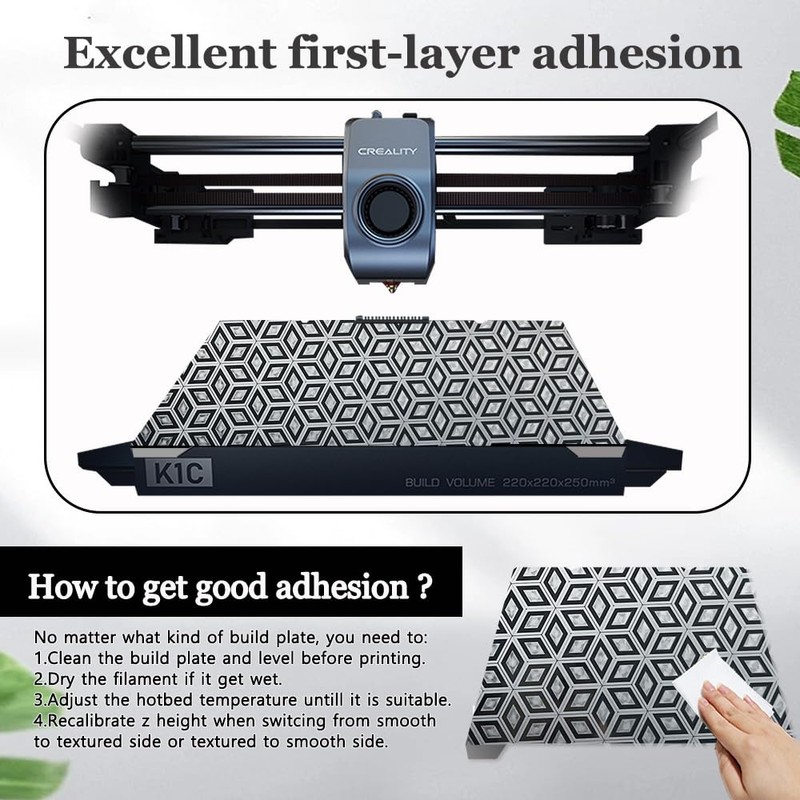 - 【Easy to Clean】The Crystal+Abyss pattern of the printed model may fade or disappear if wiped with hands or other oily objects, but don't worry, you only need to wipe the k1c build plate surface with a wet tissue and then wipe the dry it with a dry tissue to keep it clean. It will become as clean as the first time you got it, the pattern can reappear!