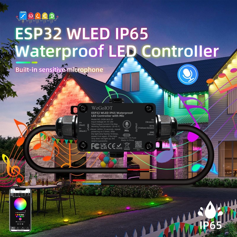 WeGoIOT Waterproof ESP32 WLED Controller with Mic , Project for Pool Boat Landscape Outdoor Lights IP65 Dynamic RGB IC DIY Lighting WiFi APP Control for WS2812B DC5-24V RGBW LED Controller (1 Channel)