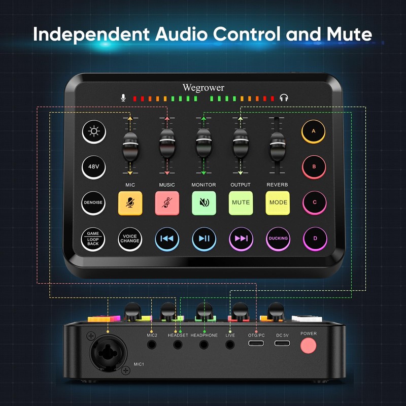 Wegrower Rechargeable Audio Mixer for Gaming & Podcasting - 48V Phantom Power, Dual Mic Inputs, RGB Lighting, 1-Click Noise Cancel, Voice Changer, Plug & Play (W-11GD)