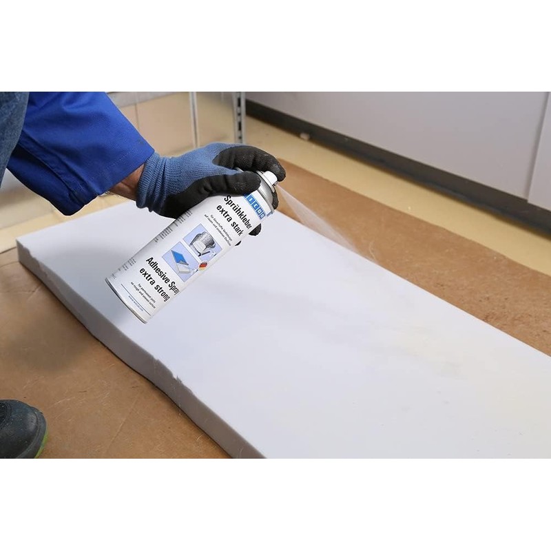 WEICON Sprühkleber 500 ml - extra stark - Spezialtyp für dauerhafte, starke Verklebungen von rauen und unebenen Oberflächen. Durch das Spezialventil lässt sich die Sprühmenge stufenlos (low/middle/high) einstellen. Anwendungsgebiete Auch für grossflächige Verklebungen von: - Filz, PVC-Folie, Kunstleder, Teppichbeläge - Kunststoff, Pappe - Schaum- und Moosgummi - Daemmstoffe, Weichschaum - Vinyl, Leder, Gummi sowie Metall und Holz