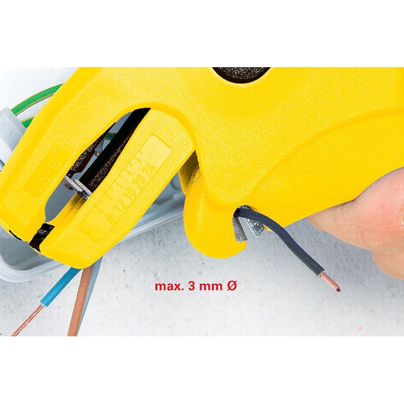 - DETAILS - The automatic cable stripper is robust / TÜV tested / has exchangeable blades / working range 1.5 - 6mm² / integrated side cutter up to 3mm / insulates precisely & quickly.