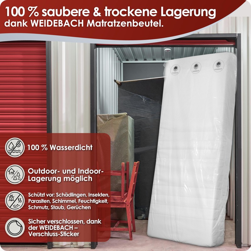 - Keeps odours and moisture away: with the robust Weidebach mattress cover, you can store the mattress as long as you like. Because the transparent and durable mattress film has been specially designed for durability.