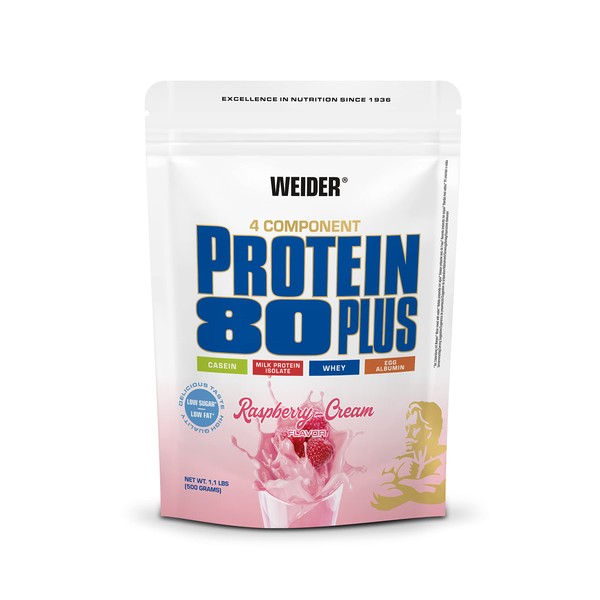 - Multi-component formula: The Protein 80 Plus delivers, depending on the flavour up to 34 g of protein (mixed with low-fat milk, 1.5%) from four different protein sources: Casein, milk protein isolate, whey protein and chicken egg protein. The high-quality protein sources contain a high proportion of essential amino acids and contribute to the maintenance and building of muscle mass*. In addition, the WEIDER Protein 80 Plus contains vitamin B6 to support normal protein metabolism.