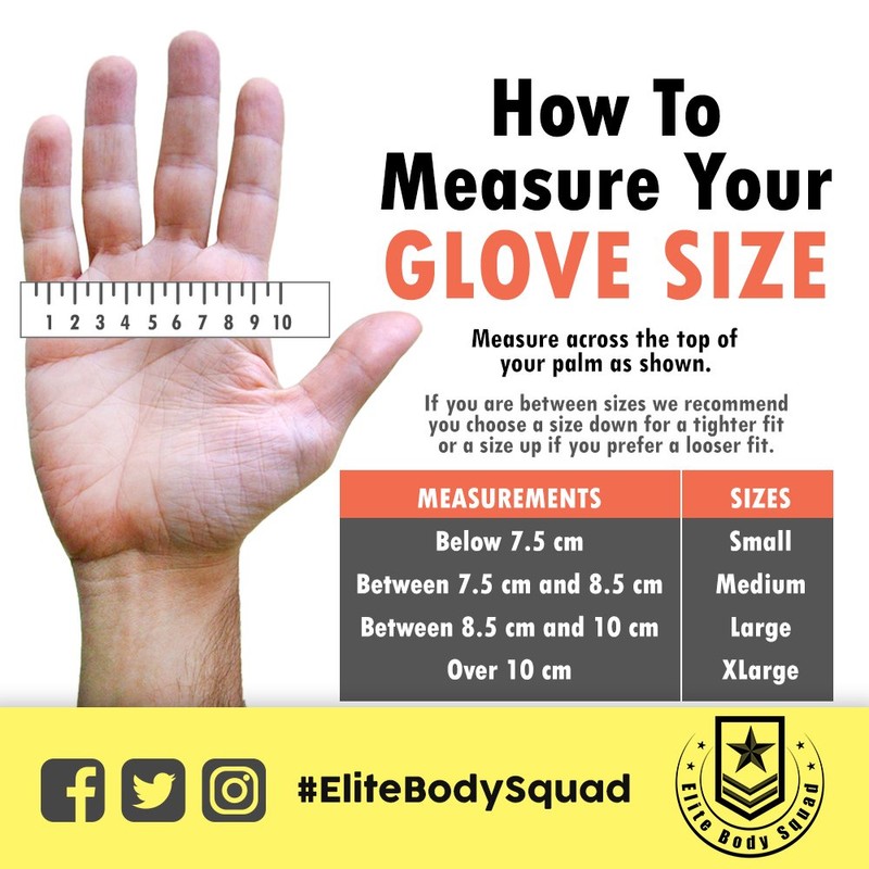 Our leather weight lifting gloves come in a range of sizes. To check your size, see the image above left.