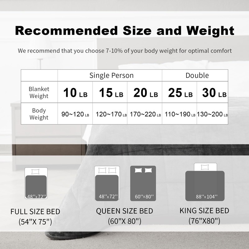 - Weight & Size Selection: Our fleece weighted blankets for adult are meant to be used individually, we recommend you choose a weighted blanket weighing about 7%-12% of your body weight. The 15 lbs weighted blanket is for adults between 120 -170 lbs.