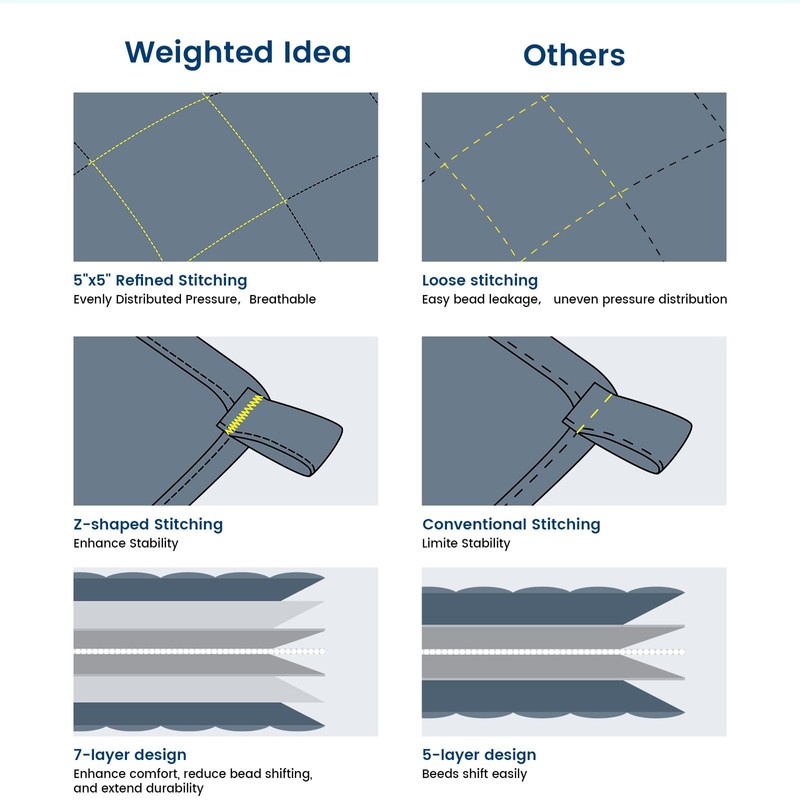 - 【UPGRADED 3.0 DESIGN】 The upgraded 5+2 layer lining design, combined with precise stitching craftsmanship, prevents bead leakage. The small enough 5”x5”compartments design ensures that the glass beads remain fixed in each compartment, ensuring even weight distribution of the twin weighted blanket.