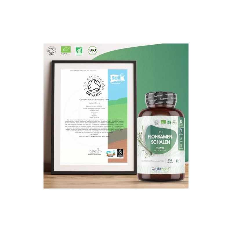 - Soil Association zertifizierte Bio Flohsamenschalen Kapseln - Alle Prozesse werden stets kontrolliert, um beste Bio Qualität zu gewährleisten und sind daher ausgezeichnet mit 4 Europäischen Zertifikaten (Soil Association) und dem Deutschen Bio Siegel. Durch das Bio Siegel sie sind frei von schädlichen Pestiziden, Spritzmitteln, Düngemitteln oder Tierversuchen. Zudem sind sie frei von Zusatzsstoffen wie Konservierungsmitteln, Aromen, Farbstoffen, Stabilisatoren und Gelatine.