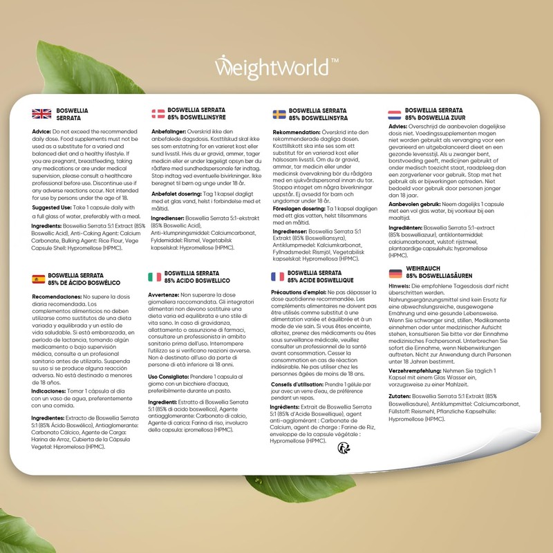 - Weihrauch Extrakt mit 85% Boswellias?uren - Unsere WeightWorld Weihrauchkapseln liefern Ihnen 400mg Boswellia Serrata Extrakt pro Kapsel. Das entspricht ganzen 2000mg Weihrauch Pulver und mit nur 1 Kapsel am Tag werden Sie mit 85% wertvoller Boswellias?uren versorgt. Bei einem Vorrat von 180 Kapseln je Flasche sind sie fr ein halbes Jahr versorgt. Menschen jeden Alters k?nnen von dem reichhaltigen Harz profitieren.