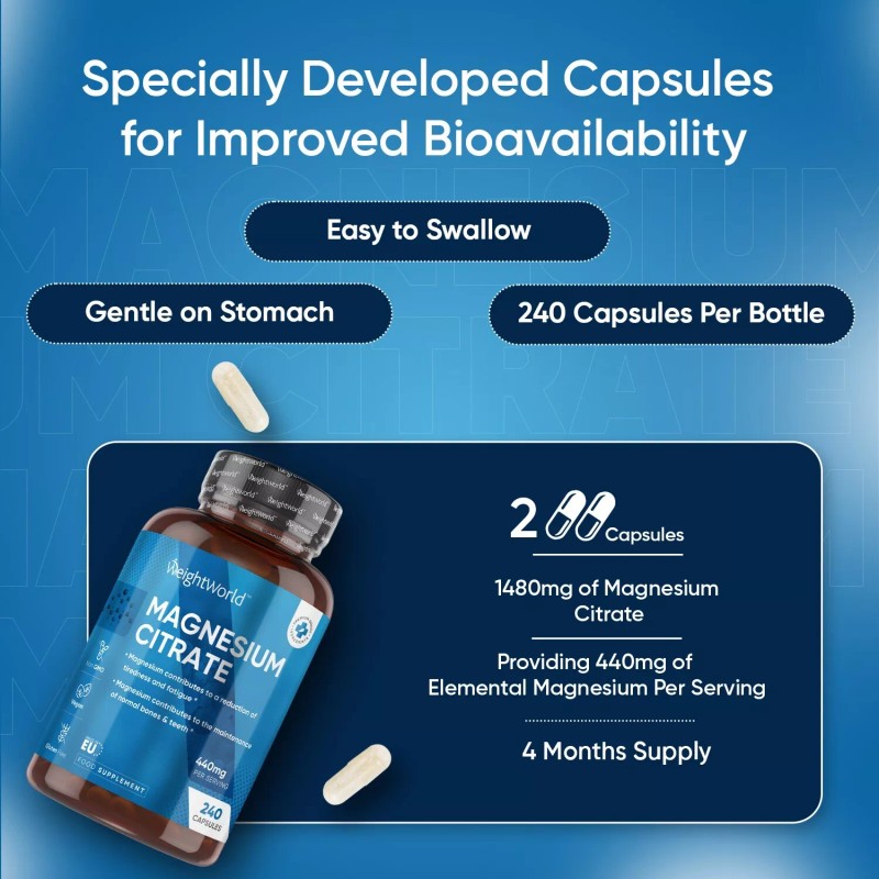 - SUPERIOR FORM OF MAGNESIUM : WeightWorld's magnesium supplements offer 1480mg of Magnesium Citrate (440mg of Elemental Magnesium) per serving. Magnesium Citrate is gentle on the stomach and has superior bioavailability, so the body absorbs it easily. Plus, it contains more elemental magnesium by weight, which gives it an above-average elemental magnesium content compared to most forms. Unlike unpalatable magnesium tablets, our magnesium citrate capsules are flavourless and easy to swallow.