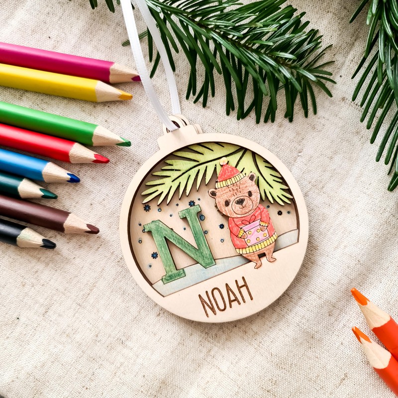 🌳 Material: Birke (Hellholz) - Die personalisierte Weihnachtskugel zum Bemalen wird mit einem weißen Satinband zum Aufhängen geliefert. Auf der Rückseite befinden sich doppelseitige Klebestreifen, damit die drei Holz-Lagen nach dem Bemalen einfach von Ihnen verklebt werden können.