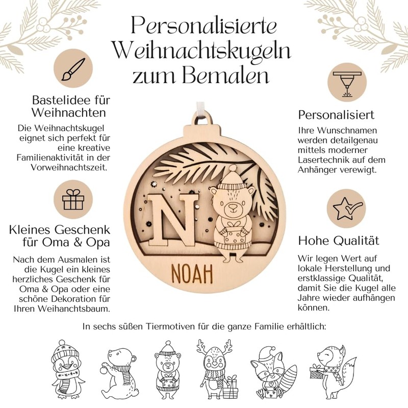 Weihnachtsbasteln mit Kindern wird dieses Jahr mit unseren personalisierten Weihnachtskugeln zum Bemalen zum kreativen Spaß für Jung und Alt. Die Weihnachtskugel mit Namen in verschiedenen Tiermotiven eignet sich perfekt als Bastelidee für eine kreative Familienaktivität in der Vorweihnachtszeit. Begeistern Sie Ihre Kleinen, indem Sie diese personalisiere Weihnachtskugeln aus Holz gemeinsam bemalen und schaffen Sie wertvolle Erinnerungen. Nach dem Weihnachtsbasteln eignen sich die fertigen Weihnachtskugeln zum Verschenken an Oma & Opa oder als Baumschmuck für den eigenen Weihnachtsbaum.