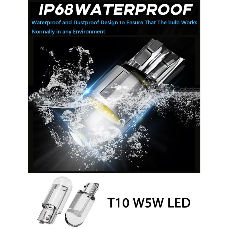 - Base type: T10 194 socket, Output: 0.03A, 0.36W, 12V, Lumen: 80 lumen/per bulb.Size: 24(height)*9(diameter)mm.Material: High quality flame retardant high temperature epoxy resin.IP68 waterproof, 360 degree illumination.Weight: 1.1 g