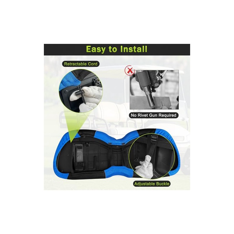 - EASY INSTALLATION: Our golf cart seat covers are easy to install, and no tools or nailsare required, just slip the covers over your existing seats and backrests and secure them with adjustable straps and telescopic buckles!