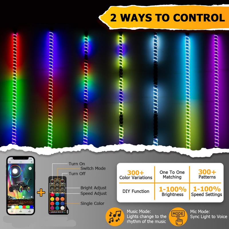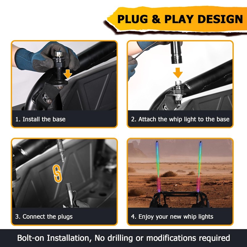 - Easy Installation: This 4FT chasing RGB LED COB Whip Light equipped with Quick connect/disconnect aluminum bases and plug & play connectors to make installation and wiring quick and easy,no drilling or modifications required.