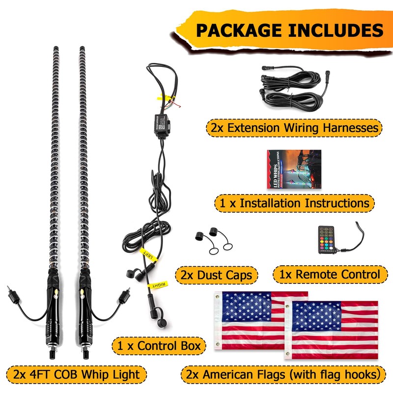 - Package Included: 2 * 4FT COB Whip Lights, 2 * American Flags (With Flag Hooks), 2 * Dust Caps, 2 * Extension Wiring Harnesses, 1 * Control Box, 1 x Installation Instructions.