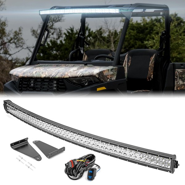 - 52" Roof LED Light Bar Kit: New upgrade design to add a 52" curved light bar pro-fit cage upper roof windshield (Note: need drilling hole). Provide powerful illumination for safer cross-country driving, firm and stable design without shake problem when long trip driving