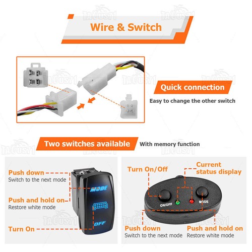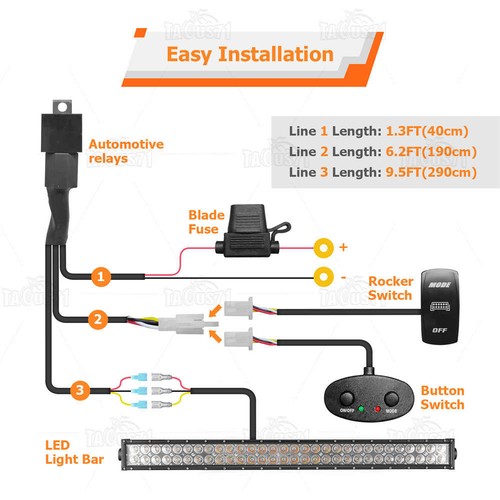 The 180w LED light bar can be controlled by a rocker switch or universal button switch that controls the light bar’s on/off and modes. You could choose the suitable switch you need. It comes with the customized 10FT 1-lead wiring harness that includes a relay, fuse, and two types of switches. The installation only needs to simply connect the red, yellow and black wires to the corresponding color connector of the light bar.