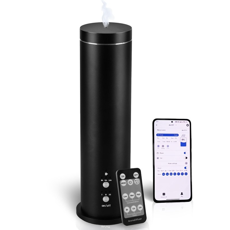 Clean Emission With No Residue Unlike traditional air fresheners, this fragrance diffuser features clean emission technology, dispersing pure scent without residue or buildup on surfaces. Enhance your home’s ambiance while maintaining a clean and fresh environment. Wide Coverage and Sleek Design Featuring a frosted aluminum exterior and minimalist silhouette. It covers an impressive area of up to 1000 sq. ft., making it ideal for large rooms, offices, bedrooms, or commercial spaces. Enjoy long-lasting fragrance in every corner of your home or workplace. Natural and Safe Using nebulization, our cold air diffuser releases a pure, dry mist of essential oils—untouched by water, which preserves the full integrity of the oils. This ensures a more potent and natural fragrance, while being safe for both families and pets. Add your favorite essential oils and enjoy the benefits of pure, unadulterated scents. Product information: Product Name: Waterless Aromatherapy Diffuser Essential Oil Bottle Capacity: 100ml Product Dimensions: L6.5 x W8.5 x H28.5(cm) Voltage: 110V-240V Material: Aluminum Alloy Product Color: Black Control Method: APP Control+Remote Control Packaging Accessories: Adapterx1 Mist Corex1 Remote Controlx1 Waterless Aroma Diffuserx1 User Manualx1